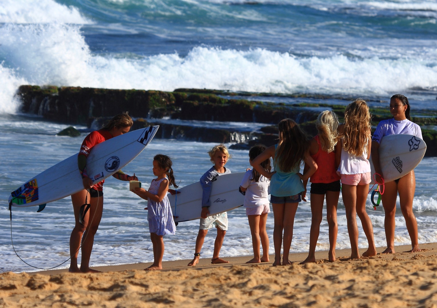 Alessa Quizon beach signing sesh with some super stoked grommie chicks! Photo: SaltyLips|Nathan Bloemers