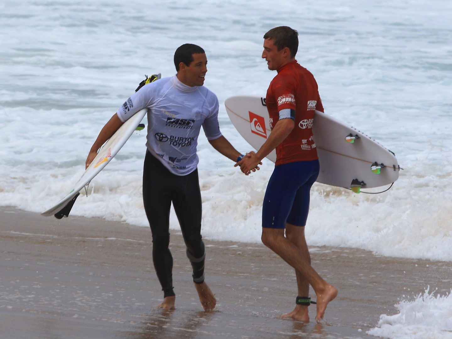 Great sportsmanship… WCT Adriano De Souza congratulating underdog Matt Banting on heat win. Photo: SaltyLips|Nathan Bloemers