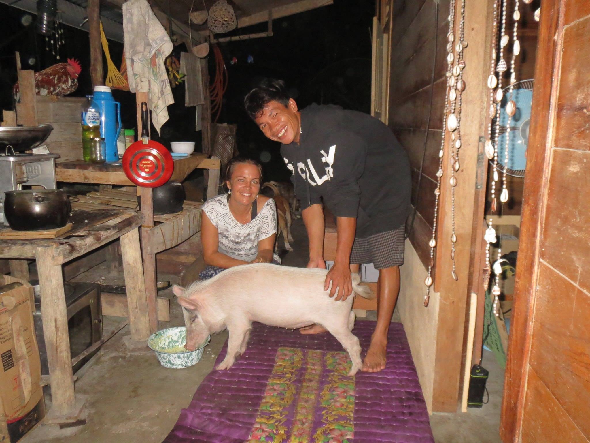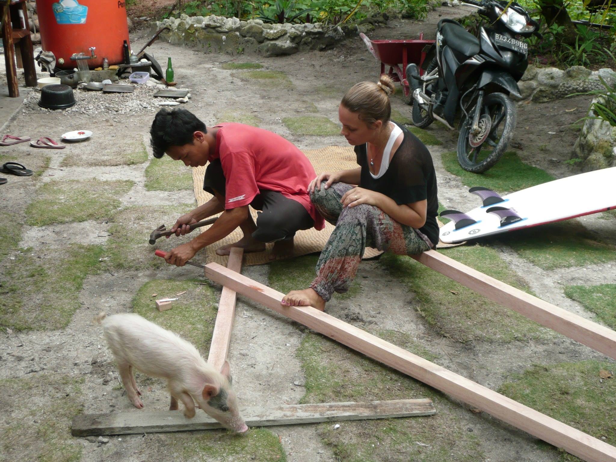 “So this past year we have built our house. We did it all ourselves, with help of Imer’s family, from cutting the wood through to building it. The whole thing! I did the ceramics, electrics and plumping myself and Dad came over to help us set up a solar power system so we have free, quiet power. Our veggie garden is getting there, so far we have tomatoes, cucumbers, chillies, sweet potatoes, lemongrass, ginger, turmeric, taro, bananas, and papayas. We’ve got so many avocado trees planted too.”